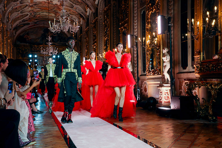 Detaliile opulente ale monumentului istoric s-au imbinat armonios cu tinutele spectaculoase, cu un design atemporal, concepute de el in cadrul acestui parteneriat. Am vazut rochii asimetrice din straturi multiple de tul, rochii lungi cu volane, bluze cu imprimeuri florale, hanorace cu gluga, haine din blana artificiala, paltoane cu broderie. Colectia cuprinde si piese vestimentare si accesorii pentru barbati, definite de aceeasi bogatie a detaliilor. (Gasesti o selectie de fotografii de pe catwalk in galeria de la finalul articolului.)